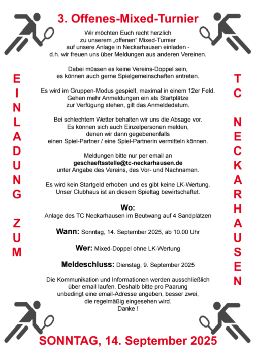 Aktuelle Neuigkeiten, Ergebnisse oder Planungen des Clubs finden Sie immer auf dieser Seite. Somit haben Sie stets den Überblick, was beim Tennisclub Neckarhausen geschieht!